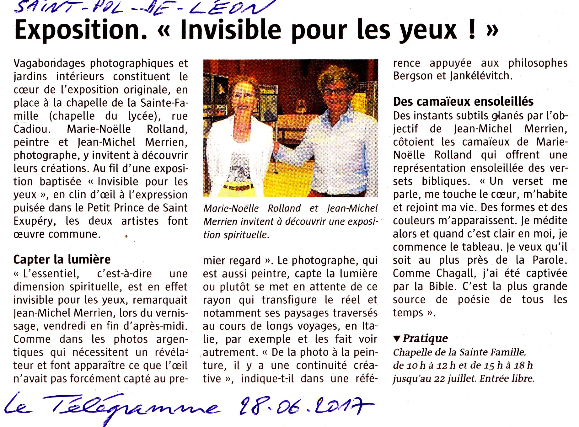SAINT-POL-DE-LEON : exposition « …invisible pour les yeux ? » avec le photographe (et peintre) Jean-Michel MERRIEN. Chapelle de la Sainte Famille (cour du lycée Notre Dame du Kreisker), du vendredi 23 juin (vernissage) au samedi 5 août. (prolongation de 2 semaines) Gratuit. |